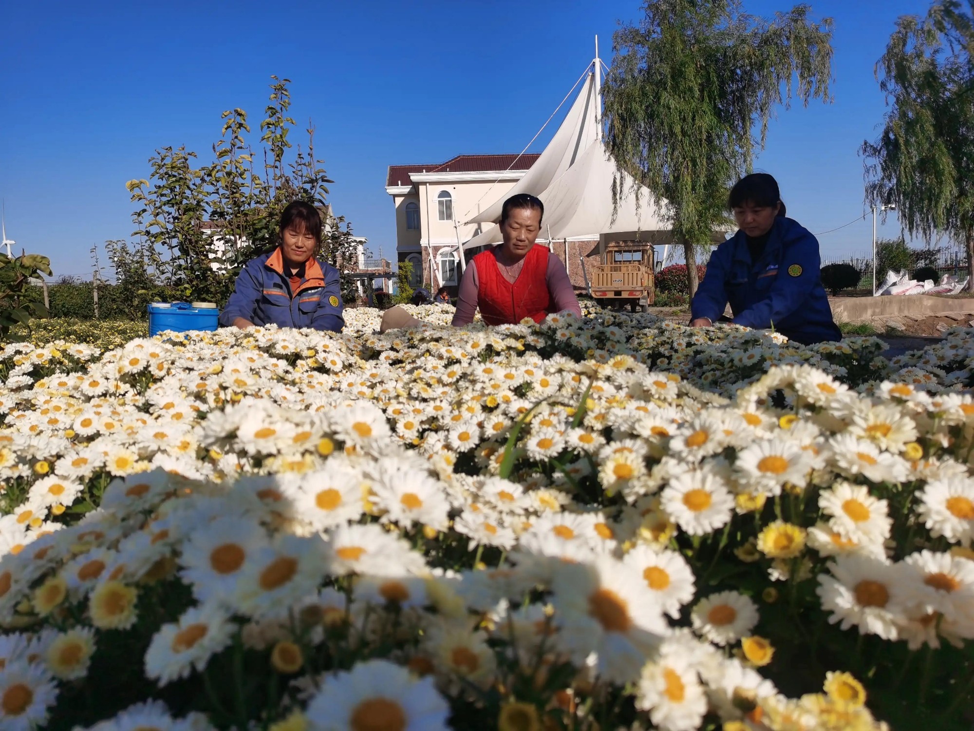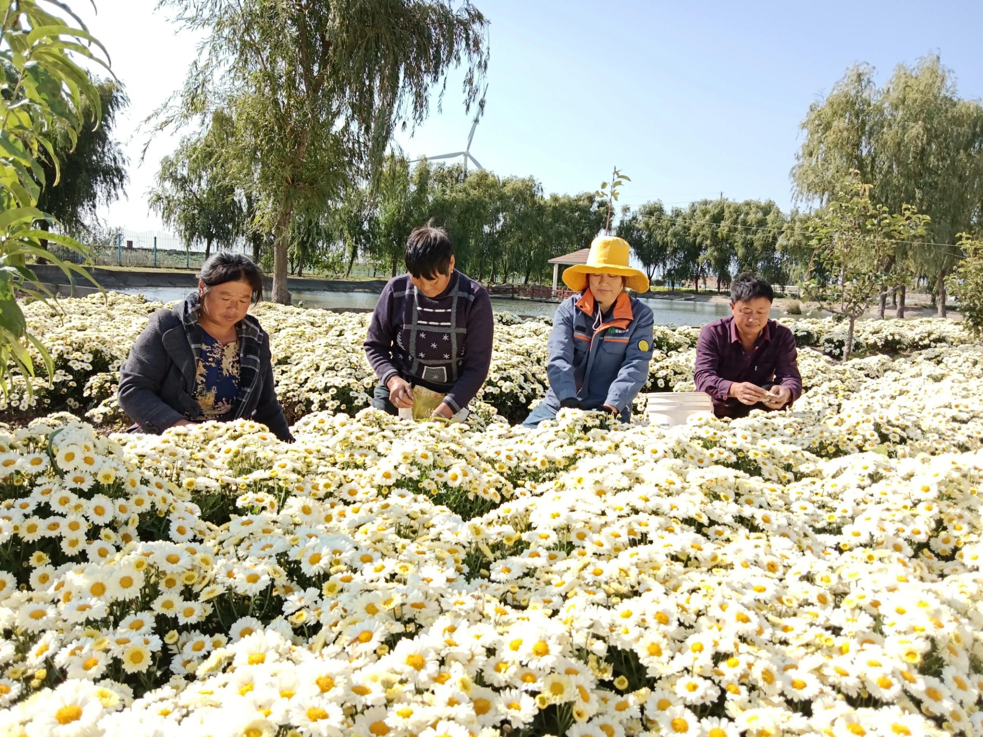 金秋十月,寶松鹽城公司今年首次種植的菊花喜獲豐收,不僅給秋日的生態(tài)園增添了一道靚麗的風(fēng)景,也為生態(tài)園帶來了一條增收的新渠道。圖為職工們正在生態(tài)園里采收菊花。